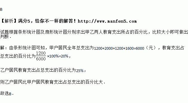 如图是两户居民家庭全年各项支出的统计图.根据统计图,下列对两户居民家庭教育支出占全年总支出的百分比作出的判断中,正确的是( )