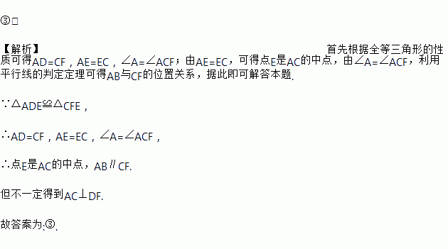 如图,点D,E分别为△ABC的边AB,AC上,若△ADE≌△CFE.则下列结论①AD=CF;②AB∥CF;③AC⊥DF;④点E是AC的中点;不一定正确的是 (填写序号).