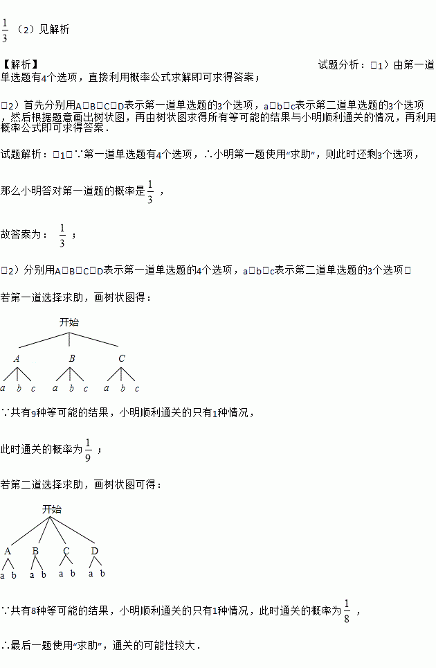СÁÁ²Î¼ÓÖлªÊ«´Ê´óÈü£¬»¹Ê£×îºóÁ½Ì⣬Èç¹û¶¼´ð¶Ô£¬¾Í¿É˳Àûͨ¹Ø£®ÆäÖеÚÒ»µÀµ¥Ñ¡ÌâÓÐ4¸öÑ¡ÏµÚ¶þµÀµ¥Ñ¡ÌâÓÐ3¸öÑ¡ÏСÁÁÕâÁ½µÀÌâ¶¼²»»á£¬²»¹ý»¹ÓÐÒ»¸ö¡°ÇóÖú¡±Ã»ÓÐʹÓã¨Ê¹ÓÃÇóÖú¿ÉÒÔÈÃÖ÷³ÖÈËÈ¥µôÆäÖÐÒ»ÌâµÄÒ»¸ö´íÎóÑ¡Ï£®