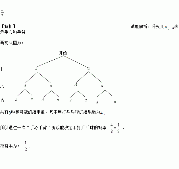 【解析】试题解析:分别用A、a表示手心和手背, 画树状图为: 共有8种等可能的结果数,其中甲打乒乓球的结果数为4, 所以通过一次“手心手背”游戏能决定甲打乒乓球的概率=. 故答案为: .