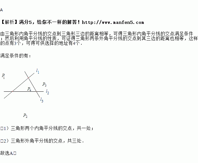 如图,直线l1,l2,l3表示三条相交叉的公路.现在要建一个加油站,要求它到三条公路的距离相等,则可供选择的地点有( )