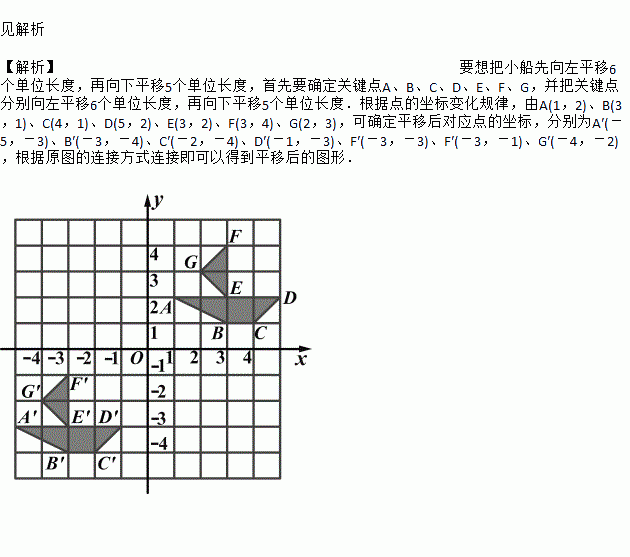 如图,将一小船先向左平移6个单位长度,再向下平移5个单位长度.试确定A、B、C、D、E、F、G平移后对应点的坐标并画出平移后的图形.