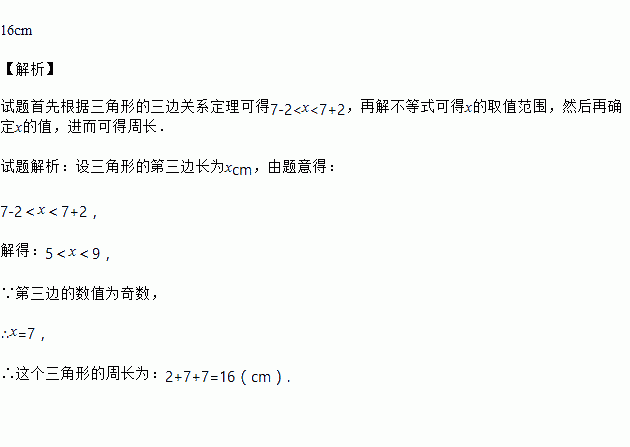 已知三角形两边的长是2 cm和7 cm,第三边的长为奇数,求这个三角形的周长。