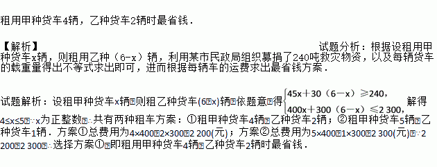 租用甲种货车4辆,乙种货车2辆时最省钱. 【解析】试题分析:根据设租用甲种货车x辆,则租用乙种(6-x)辆,利用某市民政局组织募捐了240吨救灾物资,以及每辆货车的载重量得出不等式求出即可,进而根据每辆车的运费求出最省钱方案. 试题解析:设租甲种货车x辆,则租乙种货车(6-x)辆,依题意,得解得4≤x≤5,∵x为正整数,∴共有两种租车方案:①租甲种货车4辆,乙种货车2辆;②租甲种货车5...