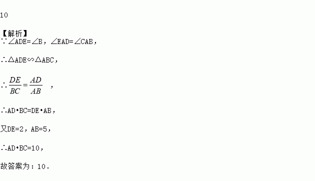 如图,在△ABC中,AB=5,D、E分别是边AC和AB上的点,且∠ADE=∠B,DE=2,那么AD•BC=________.