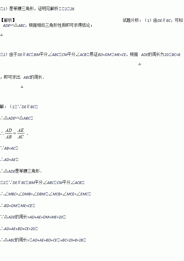 (2)若M为DE上的点,且BM平分∠ABC,CM平分∠ACB,若△ADE的周长为20,BC=8.求△ABC的周长.