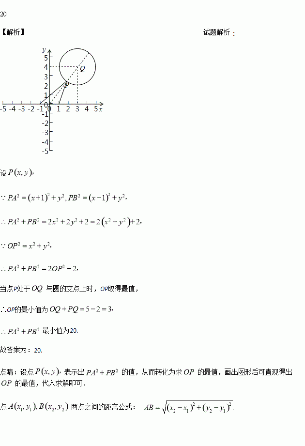 如图,在平面直角坐标系中,Q(3,4),P是在以Q为圆心,2为半径的⊙Q上一动点,A(1,0)、B(﹣1,0),连接PA、PB,则PA2+PB2的最小值是__.