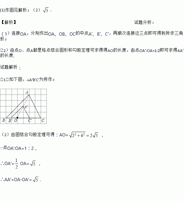 (1)作图见解析;(2). 【解析】试题分析: (1)连接OA,分别作出OA、OB、OC的中点A′、B′、C′,再顺次连接这三点即可得到所求三角形; (2)由点O、点A都是格点结合图形和勾股定理可求得得AO的长度,由点OA′:OA=1:2即可求得AA′的长度. 试题解析: (1)如下图,△A′B′C′为所作; (2)由图结合勾股定理可得:AO=, ∵点OA...