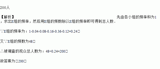 为了解各年龄段观众对某电视节目的收视率,小明调查了部分观众的收视情况,并分成A,B,C,D,E,F六组进行调查,其频率分布直方图如图所示,各长方形上方的数据表示该组的频率,若E组的频数为48,那么被调查的观众总人数为____________.