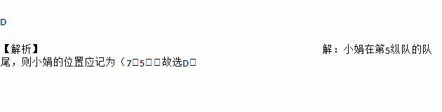 D 【解析】【解析】 小娟在第5纵队的队尾,则小娟的位置应记为(7,5).故选D.