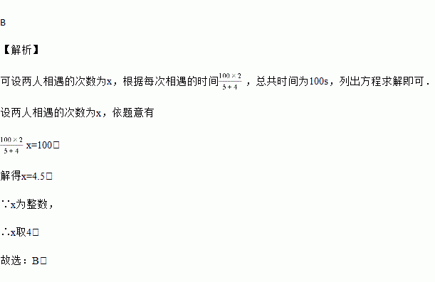 甲、乙两运动员在长为100m的直道AB(A,B为直道两端点)上进行匀速往返跑训练,两人同时从A点起跑,到达B点后,立即转身跑向A点,到达A点后,又立即转身跑向B点…若甲跑步的速度为5m/s,乙跑步的速度为4m/s,则起跑后100s内,两人相遇的次数为( )