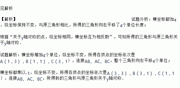 如图,若将△ABC顶点的横坐标增加4个单位,纵坐标不变,三角形将如何变化?若将△ABC顶点横坐标都乘以-1,纵坐标不变,三角形将如何变化?