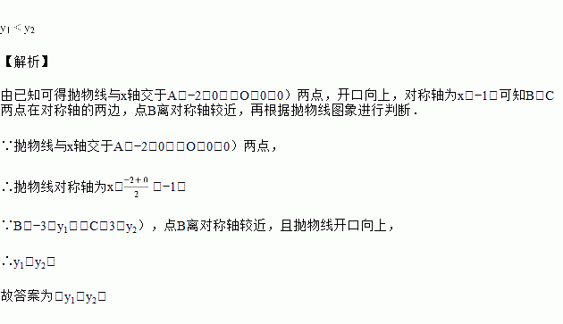 已知抛物线 y=ax2+bx+c(a>0)过 A(-2,0),O(0,0),B(-3,y1),C(3,y2)四点,则 y1与 y2的大小关系是____.