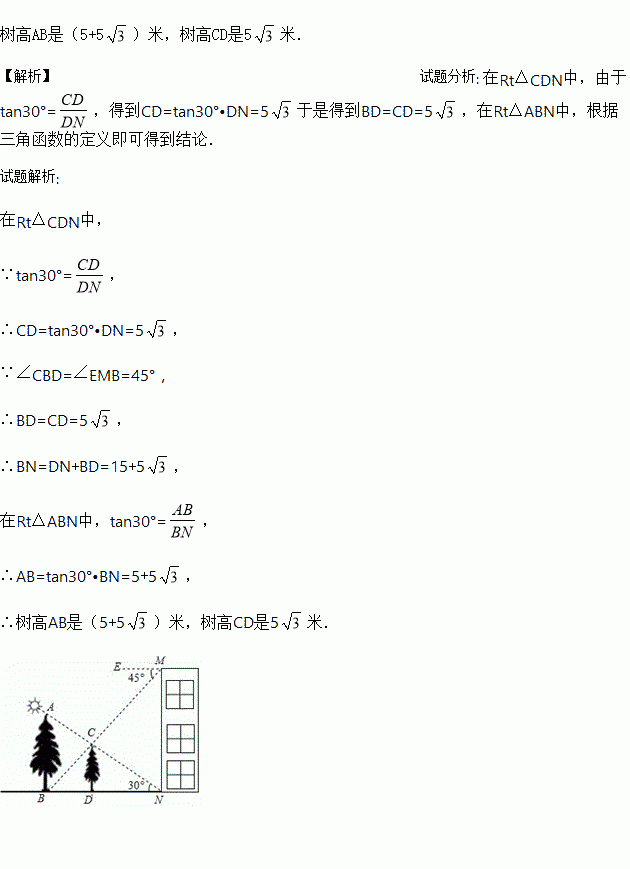 如图,在楼房MN前有两棵树与楼房在同一直线上,且垂直于地面,为了测量树AB、CD的高度,小明爬到楼房顶部M处,光线恰好可以经过树CD的顶站C点到达树AB的底部B点,俯角为45°,此时小亮测得太阳光线恰好经过树CD的顶部C点到达楼房的底部N点,与地面的夹角为30°,树CD的影长DN为15米,请求出树AB、CD的高度.(结果保留根号)