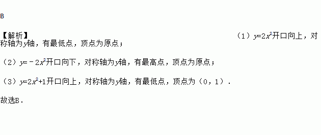 B 【解析】(1)y=2x2开口向上,对称轴为y轴,有最低点,顶点为原点; (2)y=﹣2x2开口向下,对称轴为y轴,有最高点,顶点为原点; (3)y=2x2+1开口向上,对称轴为y轴,有最低点,顶点为(0,1). 故选B.