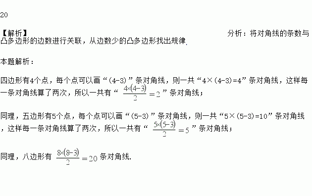 20 【解析】分析:将对角线的条数与凸多边形的边数进行关联,从边数少的凸多边形找出规律. 本题解析: 四边形有4个点,每个点可以画“(4-3)”条对角线,则一共“4×(4-3)=4”条对角线,这样每一条对角线算了两次,所以一共有“ ”条对角线; 同理,五边形有5个点,每个点可以画“(5-3)”条对角线,则一共“5×(5-3)=10”条对角线,这样每一条对角线算了两次,所以一...