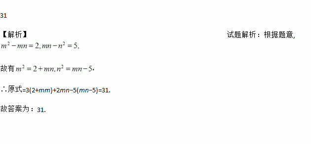 已知m2﹣mn=2,mn﹣n2=5,则3m2+2mn﹣5n2=________.