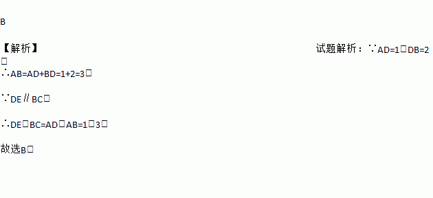 在△ABC中,DE∥BC,若AD=1,DB=2,则的值为( )
