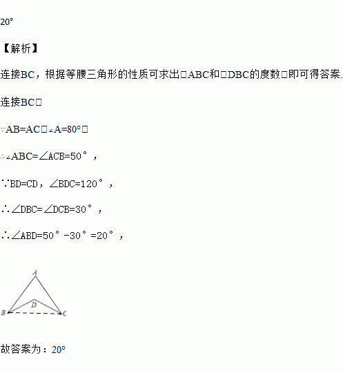 如图,若AB=AC,BD=CD,∠A=80°,∠BDC=120°,则∠B=______°.