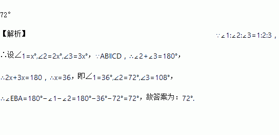 如图,已知AB∥CD,∠l:∠2:∠3=1:2:3,则∠EBA的度数为____________.