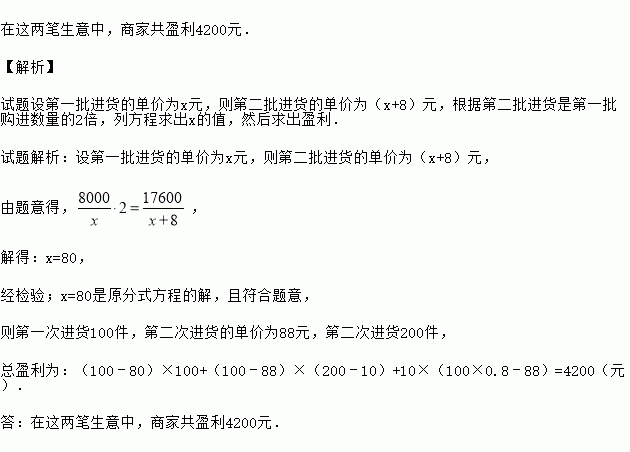 某服装商预测一种应季衬衫能畅销市场,就用8000元购进一批衬衫,面市后果然供不应求,服装商又用17600元购进了第二批这种衬衫,所购数量是第一批购进数量的2倍,但单价贵了8元.商家销售这种衬衫时每件定价都是100元,最后剩下10件按8折销售,很快售完.在这两笔生意中,商家共盈利多少元?
