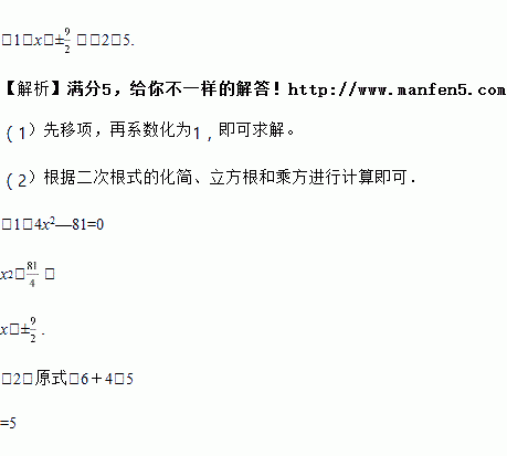 (1)解方程:4x2—81=0; (2)计算:+-()2;