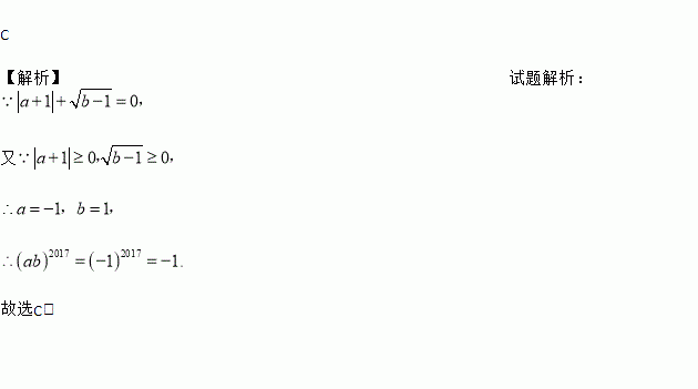 若a、b为实数,且|a+1|+=0,则(ab)2017的值为( )