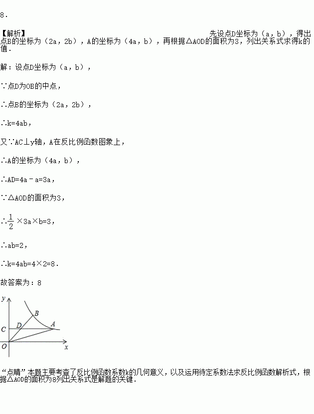 图象上的两点,过点A作AC⊥y轴,垂足为C,AC交OB于点D.若D为OB的中点,△AOD的面积为3,则k的值为_____.
