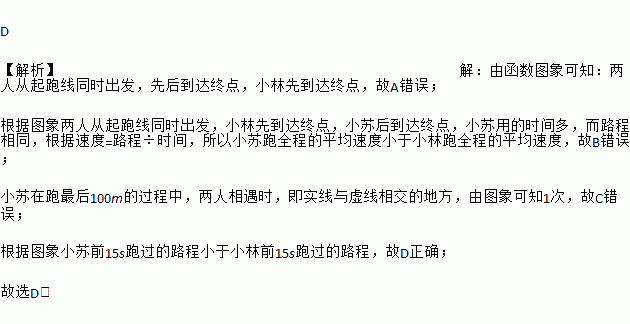 D. 小苏前15s跑过的路程小于小林前15s跑过的路程.