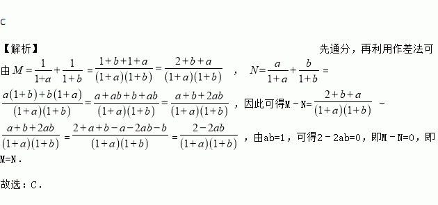 C 【解析】先通分,再利用作差法可由= , =,因此可得M﹣N=﹣==,由ab=1,可得2﹣2ab=0,即M﹣N=0,即M=N. 故选:C.