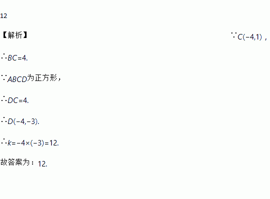 如图,四边形ABCD为正方形,点A、B在y轴上,点C的坐标为(-4,1),反比例函数y=的图象经过点D,则k的值为________.