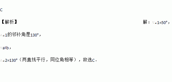 C 【解析】【解析】 ∵∠1=50°, ∴∠1的邻补角是130°, ∵a∥b, ∴∠2=130°(两直线平行,同位角相等),故选C.
