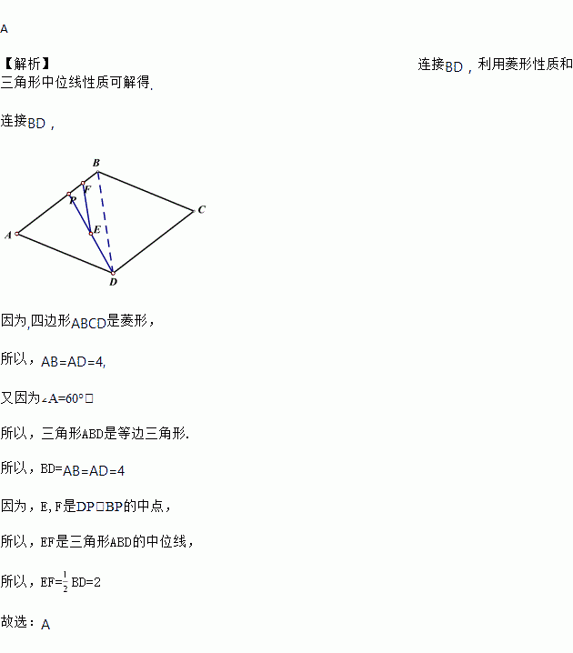 如图,在菱形ABCD中,∠A=60°,AD=4,点P是AB边上的一个动点,点E、F分别是DP、BP的中点,则线段EF的长为( )