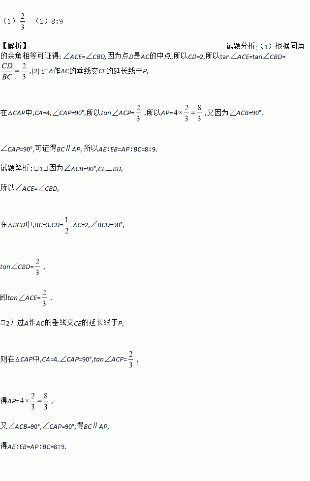 如图,在△ABC中,∠ACB=90°,AC=4,BC=3,D是边AC的中点,CE⊥BD交AB于点E.