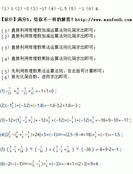 (4)[ 2- ()×24 ]÷5×(- 1)2001