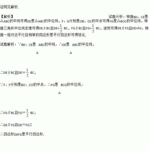 已知:△ABC的中线BD、CE交于点O,F、G分别是OB、OC的中点.求证:四边形DEFG是平行四边形.