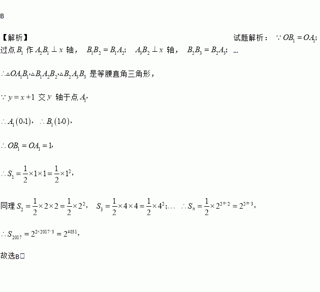如图,直线l:y=x+1交y轴于点A1,在x轴正方向上取点B1,使OB1=OA1;过点B1作A2B1⊥x轴,交l于点A2,在x轴正方向上取点B2,使B1B2=B1A2;过点B2作A3B2⊥x轴,交l于点A3,在x轴正方向上取点B3,使B2B3=B2A3;…记△OA1B1面积为S1,△B1A2B2面积为S2,△B2A3B3面积为S3,…则S2017等于( )