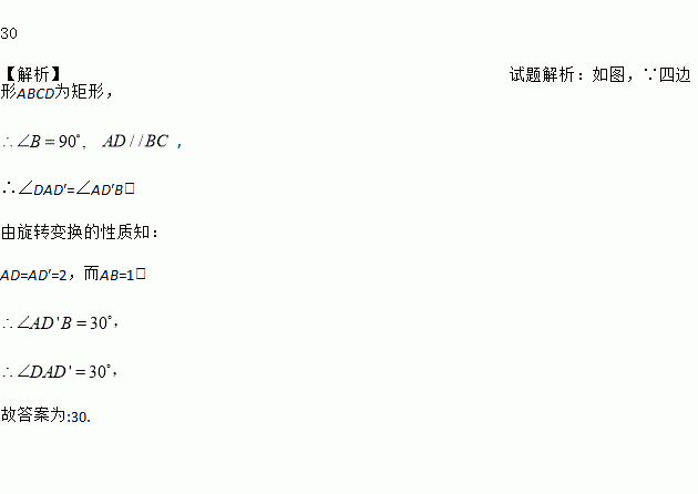 如图,在矩形ABCD中,AB=1,AD=2,将AD绕点A顺时针旋转,当点D落在BC上点D′时,则∠DAD′=_____度.