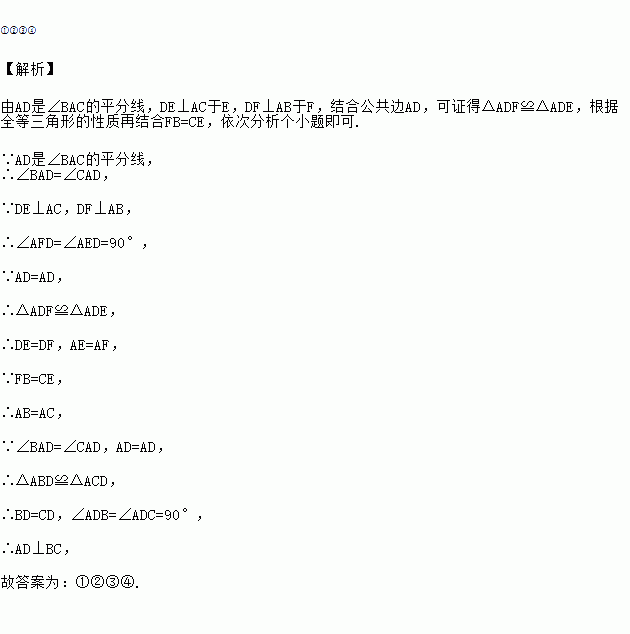 如图:在△ABC中,AD是∠BAC的平分线,DE⊥AC于E,DF⊥AB于F,且FB=CE,则下列结论:①DE=DF,②AE=AF,③BD=CD,④AD⊥BC。