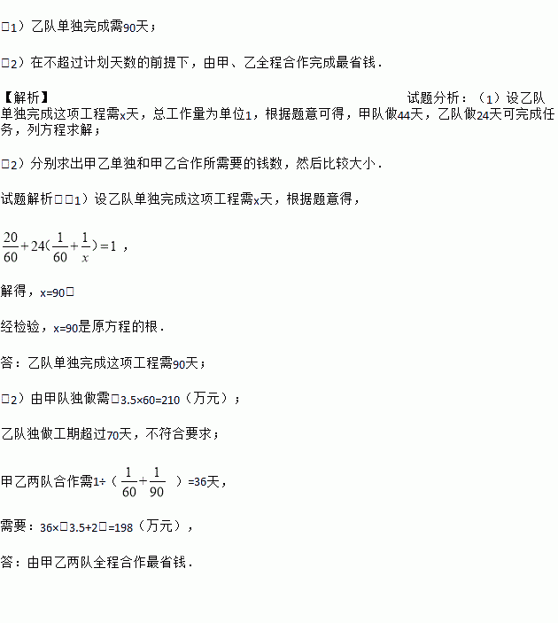 (1)乙队单独完成需90天; (2)在不超过计划天数的前提下,由甲、乙全程合作完成最省钱. 【解析】试题分析:(1)设乙队单独完成这项工程需x天,总工作量为单位1,根据题意可得,甲队做44天,乙队做24天可完成任务,列方程求解; (2)分别求出甲乙单独和甲乙合作所需要的钱数,然后比较大小. 试题解析:(1)设乙队单独完成这项工程需x天,根据题意得, , 解得,x...