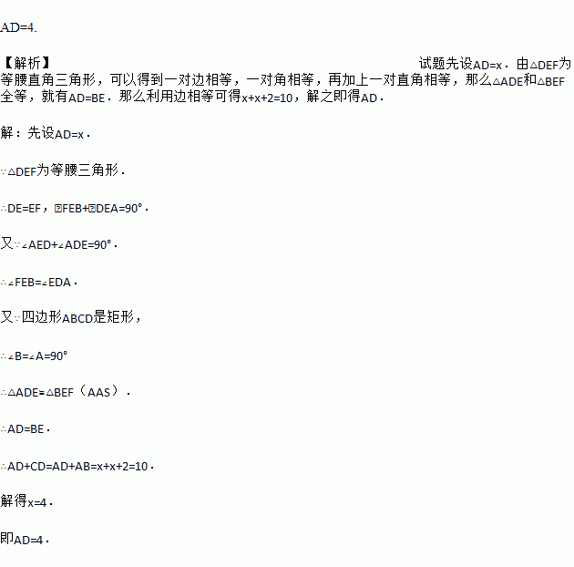 在矩形ABCD中,点E、F分别在AB,BC上,△DEF为等腰直角三角形,∠DEF=90°,AD+CD=10,AE=2,求AD的长.