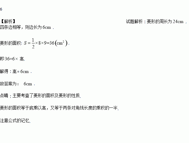 菱形的两条对称线长为8cm和9cm,周长为24cm,则菱形的高为____