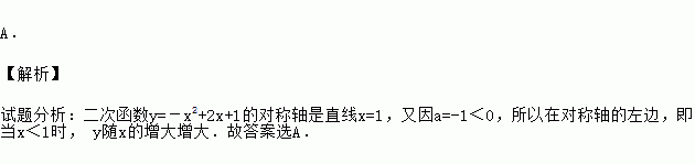 A. 【解析】 试题分析:二次函数y=-x2+2x+1的对称轴是直线x=1,又因a=-1<0,所以在对称轴的左边,即当x<1时, y随x的增大增大.故答案选A.