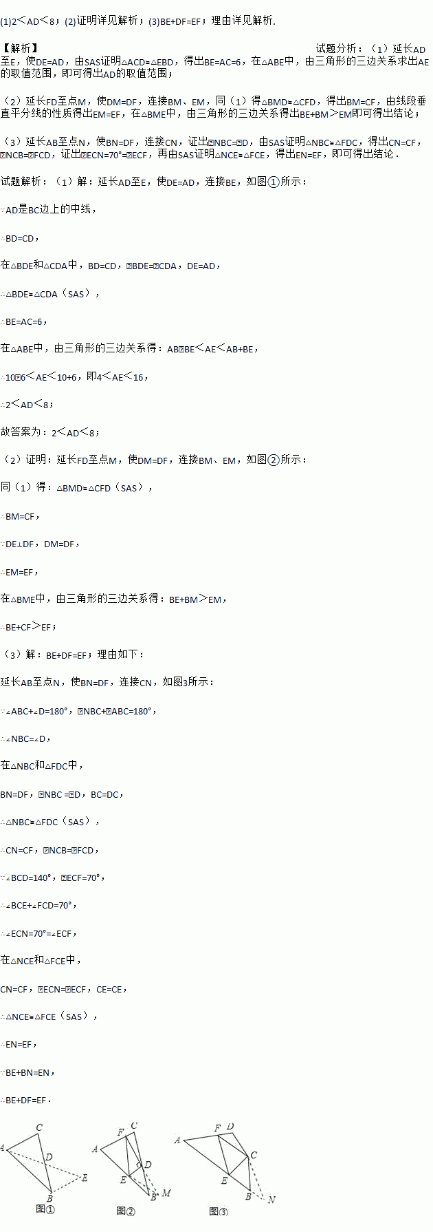 解决此问题可以用如下方法:延长AD到点E使DE=AD,再连接BE(或将△ACD绕着点D逆时针旋转180°得到△EBD),把AB、AC,2AD集中在△ABE中,利用三角形三边的关系即可判断.中线AD的取值范围是 ;