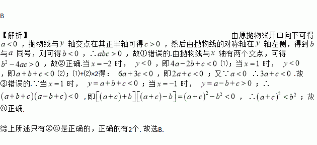 B 【解析】由原抛物线开口向下可得,抛物线与轴交点在其正半轴可得,然后由抛物线的对称轴在轴左侧,得到与同号,则可得,∴,故①错误的.由抛物线与轴有两个交点,可得,故②正确.当时, ,即⑴;当时, ,即⑵;⑴+⑵×2得: ,即;又∵ ∴.故③错误的.∵当时, ;当时, ;∴ , 即, ∴;故④正确. 综上所述只有②④是正确的,正确的有2个. 故选B.