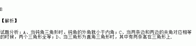 B 【解析】 试题分析:A、当钝角三角形时,钝角的外角就小于内角;C、当两条边和两边的夹角对应相等的时候,两个三角形全等;D、当三角形为直角三角形时,其中有两条高在三角形上.