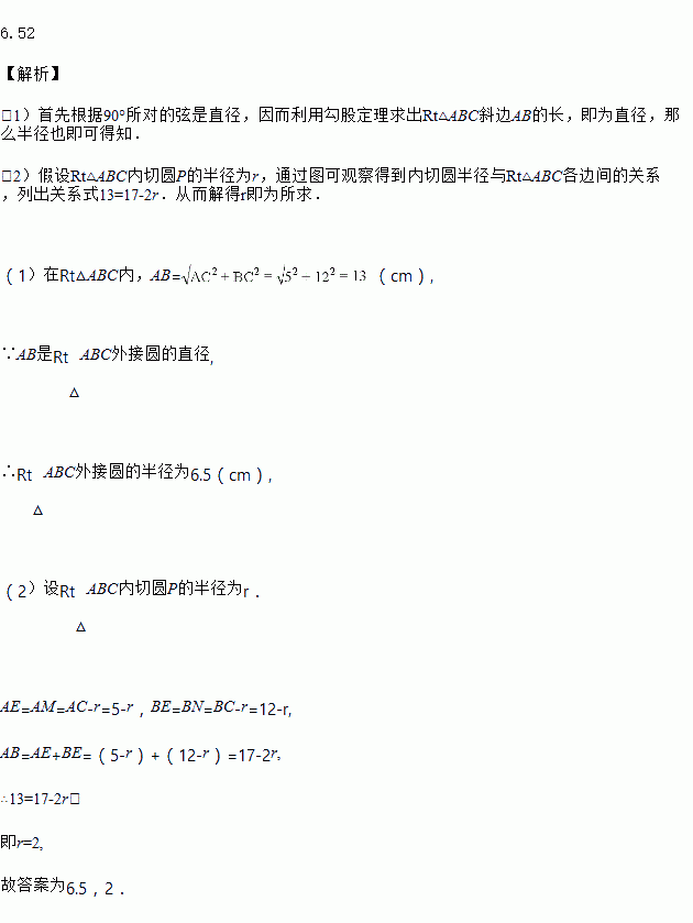 若直角三角形的两条直角边、的长分别是和,则此直角三角形外接圆半径为________,内切圆半径为________.