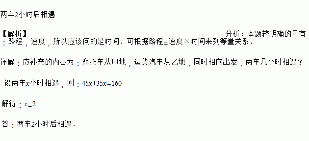 初一学生王马虎同学在做作业时,不慎将墨水瓶打翻,使一道作业只能看到:甲、乙两地相距160千米,摩托车的速度为45千米/时,运货汽车的速度为35千米/时, ?请你将这道作业题补充完整并列出方程解答.