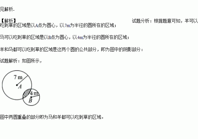 在一片草地上的A,B两处栓了一匹马和一只羊,其中栓羊的绳子长4m,栓马的绳子长7m,AB=9m,如图所示,请你画出马和羊都可以吃到草的区域.