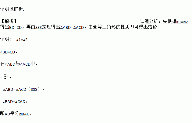已知:如图,点D是△ABC内一点,AB=AC,∠1=∠2.求证:AD平分∠BAC.
